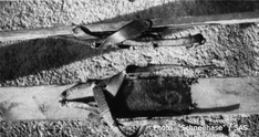 Patent CH77396. Binding with iron jaw and toe straps but without straps around the heel. It consists of two cables, connected at the front to a tightener and at the back to partially bent sheets which grip the sole of the boot. When tightening, the boot is pressed against the iron jaw thus preventing it to slide neither to the side nor in the longitudinal direction of the ski.